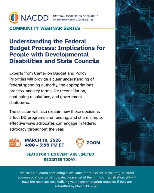 This webinar featuring guests from Center on Budget and Policy Priorities (CBPP) aims to provide attendees a clear understanding of the federal budget, appropriations process, reconciliation, and more — all of which can impact Developmental Disabilities (DD) Councils and People with Disabilities. Also discussed: concrete ways to engage in year-round federal advocacy.